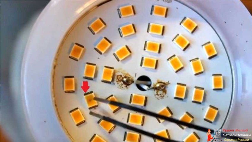 До этого момента все просто и понятно, ремонт светодиодной лампочки трудностей, пока, не представляет. Теперь надо решить, как паять мелкие светодиоды. Вся штука в том, что они припаяны на подложку, хорошо проводящую тепло. То есть, прогревая контакт одного светодиода вы, одновременно, греете всю плату. Если действовать маломощным паяльником понадобится слишком много времени. Мощный — тоже не вариант, так как перегреть очень легко. Максимальная температура, которую кристаллы выносят без последствий — 80°C. При дальнейшем нагреве быстро идет разрушение, поэтому при ремонте светодиодной лампочки основная задача — как можно меньше нанести вреда остальным элементам.