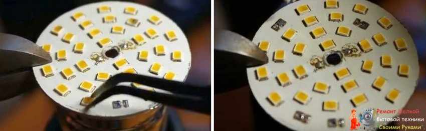 На месте выпаянных светодиодов остаются контактные площадки. На них наносим каплю флюса для пайки, сверху выкладываем исправные (с соблюдением полярности) и снова прогреваем, но на этот раз на кристалл надавливаем. Когда его ножки «войдут» в припой, плату снимаем или переворачиваем. Если светодиода нет, можно вместо него впаять отрезок проволоки. Светить лампа будет чуть тусклее, но работать будет. Да! Этот фокус работает, только если на плате десять и больше кристаллов.