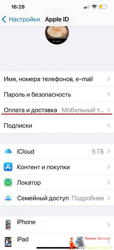 - Откройте «Настройки» и перейдите в свою учетную запись Apple ID. Выберите раздел «Оплата и доставка».