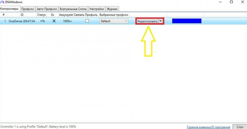 - Выйдите из игры и зайдите в DS4Windows. Около слова Deafault есть кнопочка «Редактировать (Edit)» — жмем по ней.