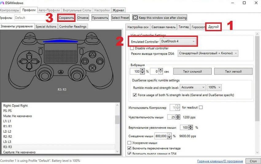 Заходим и проверяем в игре, не поменялись ли кнопки вместо А, В — крестик и кружок, как положено. Если геймпад перестал работать, то возвращаем как было — в Emulated Controller выбираем Xbox 360. Придется запомнить кнопки консоли Microsoft: