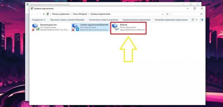 - Дважды кликаем по соединению от поставщика Apple Mobile Device Ethernet.