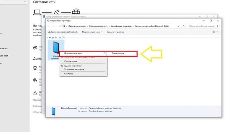 - Теперь осталось щелкнуть правой кнопкой мыши по добавленному устройству, навести курсор на «Подключаться через» → «Точка доступа».