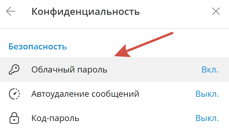 - Android: «Настройки» → «Конфиденциальность» → «Облачный пароль».