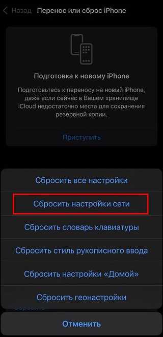 Сбросим сеть и ее параметры. Очистим все настройки Wi-Fi, пароли, параметры сотовой сети и сопряжение Bluetooth со всеми девайсами. Таким образом не удалятся ваши фото и видео, а также приложения или данные, не волнуйтесь. Открываем «Настройки» → «Основные». Находим снизу строку «Перенос или сброс iPhone» — лезем туда. После нажатия на кнопку «Сбросить» тапните по «Сбросить настройки сети».