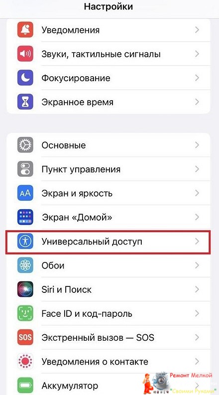 Переходим в «Настройки», далее нас интересует пункт «Универсальный доступ».