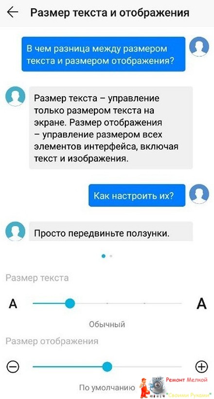 Здесь вы можете заметить два бегунка: размер текста, размер отображения.