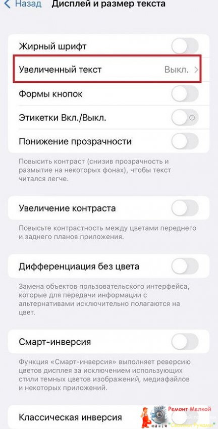 Тапаем по пункту «Увеличенный текст» (здесь также можно выбрать функцию «Жирный шрифт», чтобы увеличить контуры текста и сделать его заметнее).