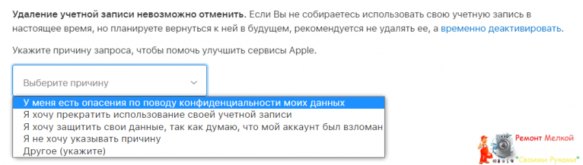 - На новой странице появится подробное описание последствий удаления аккаунта. Если вы согласны с ними, выберите причину удаления Apple ID и нажмите «Продолжить».