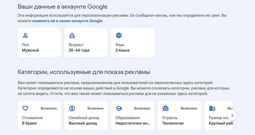 эту страницу и перейдя на вкладку конфиденциальность, вы можете узнать о вашем поле, примерном возрасте, уровне дохода и даже о том, находитесь ли вы в браке. Хотя, конечно, поисковик — это все-таки не спецслужбы, и опосредованно собираемая им информация не всегда бывает точной.