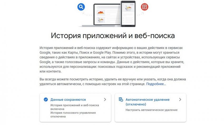 На этой странице можно увидеть информацию о ваших действиях в сервисах Google, таких как Карты, Поиск и Play Store. Здесь же хранятся данные о ваших действиях в приложениях, на сайтах и устройствах, использующих сервисы Google, а также голосовые запросы и команды. При этом вы можете удалить историю за последний час, день или даже все время.