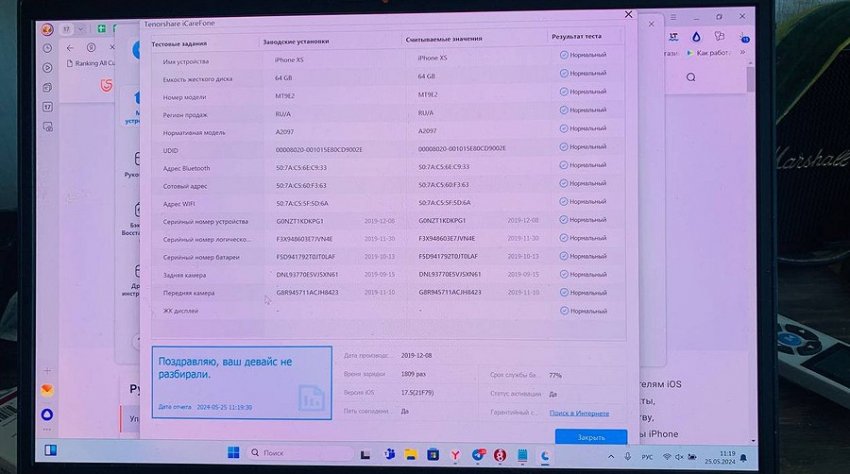 Для проверки нужно просто подключить iPhone к ПК проводом, запустить программу и нажать «Отчет о тестах». Внизу вы увидите остаточную емкость аккумулятора, число циклов зарядки и другую информацию о вашем iPhone.