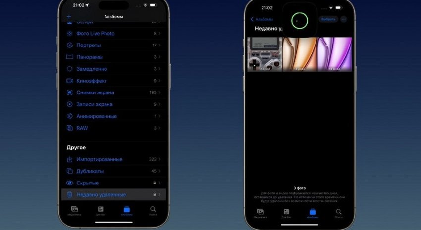 В приложении «Фото» на iPhone привычная нам корзина вынесена в раздел под названием «Недавно удалённые». Чтобы восстановить фотографию, нужно перейти в приложение «Фото» > «Альбомы» и пролистать вниз до раздела «Другое» > «Недавно удалённые». Теперь нужно авторизоваться по Face ID, Touch ID или паролю.