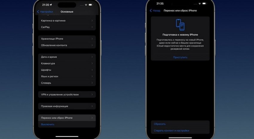 После создания нового бэкапа можете перейти на iPhone в меню «Настройки» > «Основные» > «Перенос или сброс iPhone» > «Стереть контент и настройки». Заранее убедитесь, что вы помните пароль от Apple ID. Спустя несколько минут все данные будут удалены, а вы сможете запустить процесс восстановления из резервной копии.