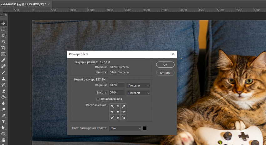 - Увеличьте значения длины и ширины холста. Поскольку мы увеличиваем не изображение, а именно его размер его подложки, на масштаб и пропорции такие действия не повлияют.