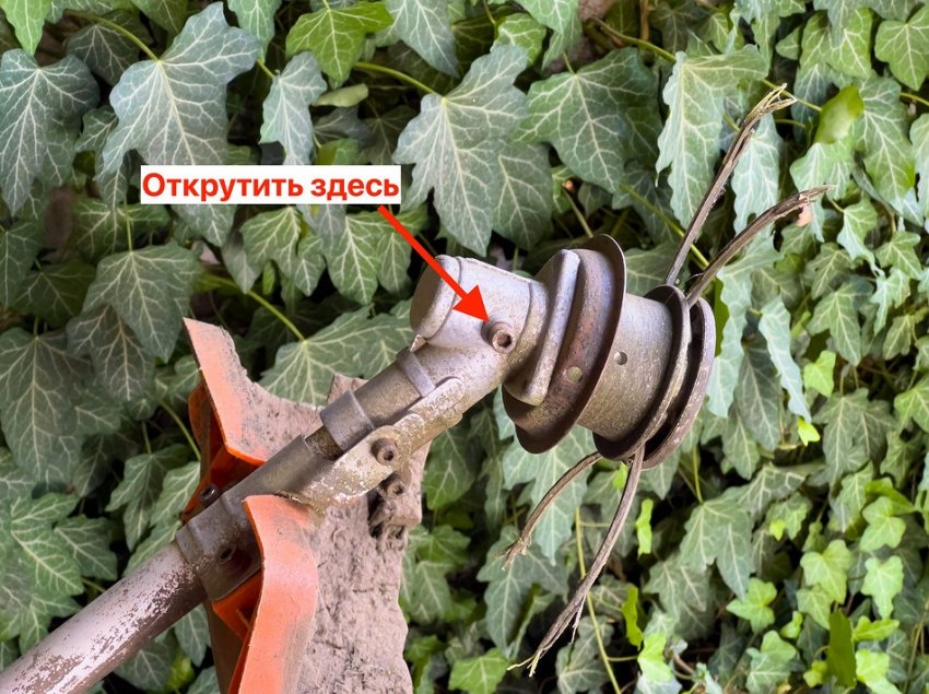 - Медленно выдавливаем ее в отверстие, одновременно прокручивая вал триммера.