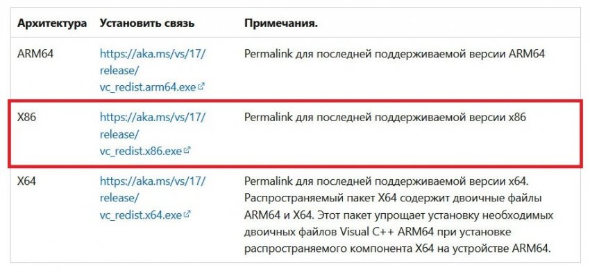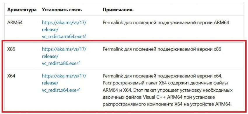 - Если у вас 64-битная Windows 11, 10, 8.1 или 7, скачайте файлы vc_redist.x64.exe и vc_redist.x86.exe для архитектур X64 и X86. Если вы пользуетесь 32-битной версией операционной системы, ограничьтесь загрузкой и установкой vc_redist.x86.exe.