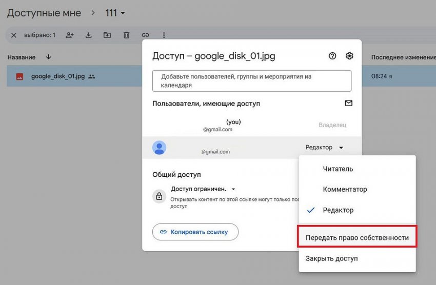 - откройте дополнительное меню напротив своего дополнительного аккаунта, выберите «Передача права собственности» и нажмите «Отправить приглашение»;