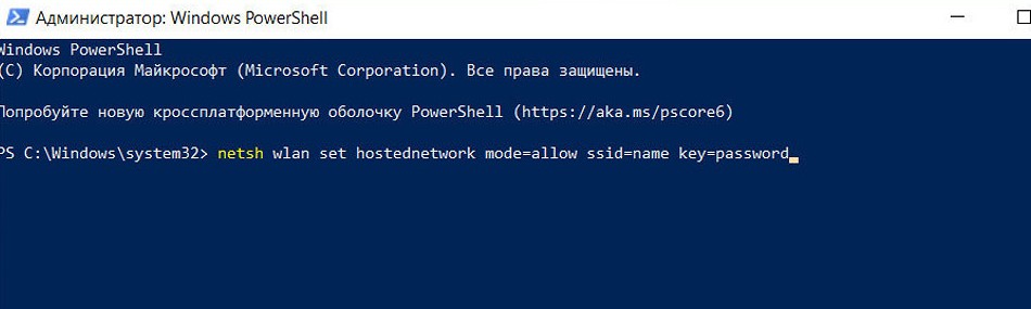 - Введите команду netsh wlan set hostednetwork mode=allow ssid=name key=password, где name — имя сети Wi-Fi, которую вы хотите создать, а password — пароль для доступа к ней.