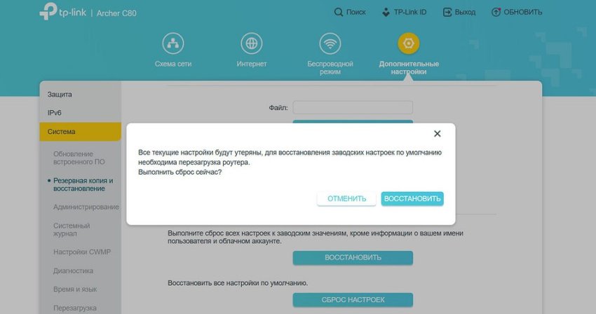 Подтвердите сброс, нажав кнопку «Восстановить» и дождитесь завершения процедуры.
