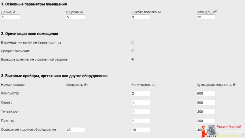 Рассчитать необходимую мощностью устройства можно самостоятельно, но проще это сделать в специальном калькуляторе — такие можно найти на сайтах производителей. Например, Mitsubishi Electric предлагает учитывать не только параметры помещения, но и количество электронных приборов и даже людей, которые находятся в комнате.