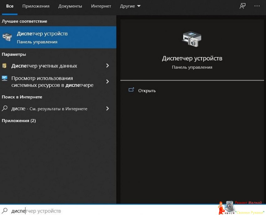 - Введите в поле поиска «Диспетчер устройств» (обычно достаточно первых 3-4 букв) и кликните по появившейся надписи. Этого же результата можно добиться, нажав сочетание клавиш Win+R и введя команду «devmgmt.msc» (без кавычек), или просто найдя «Диспетчер устройств» в «Панели управления».