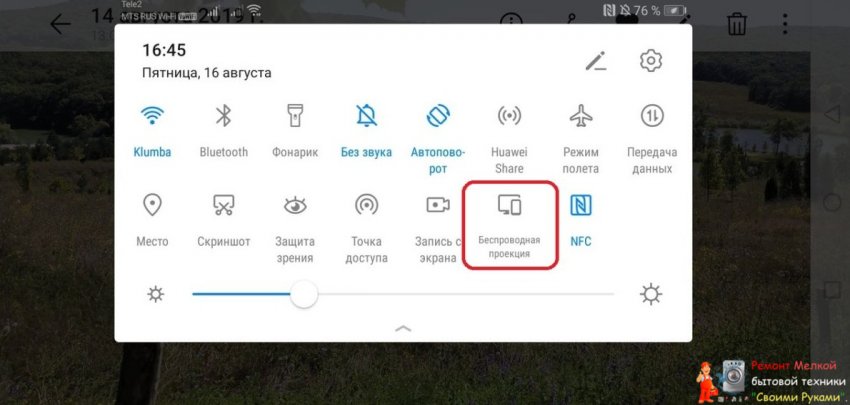 - Откройте шторку и кликните по иконке с квадратом (на ней также может быть нарисован телефон или волны, как у значка Wi-Fi). В зависимости от оболочки, она может иметь разные имена. К примеру, в смартфонах Samsung она называется Smart View.