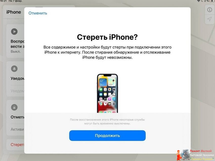 - Система предупредит, что после сброса вы потеряете все сохраненные настройки и данные, а обнаружение и отслеживание айфона будет невозможно.